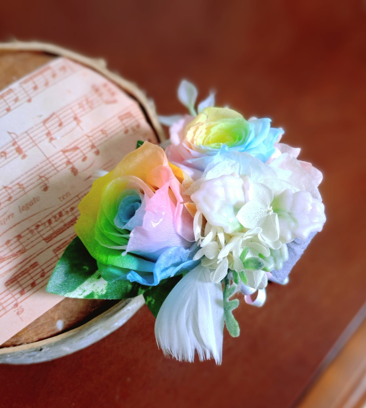 特別な日を彩るプリザーブドコサージュです。優しいカラーのレインボーローズが、シーンに華やかさを添えます。