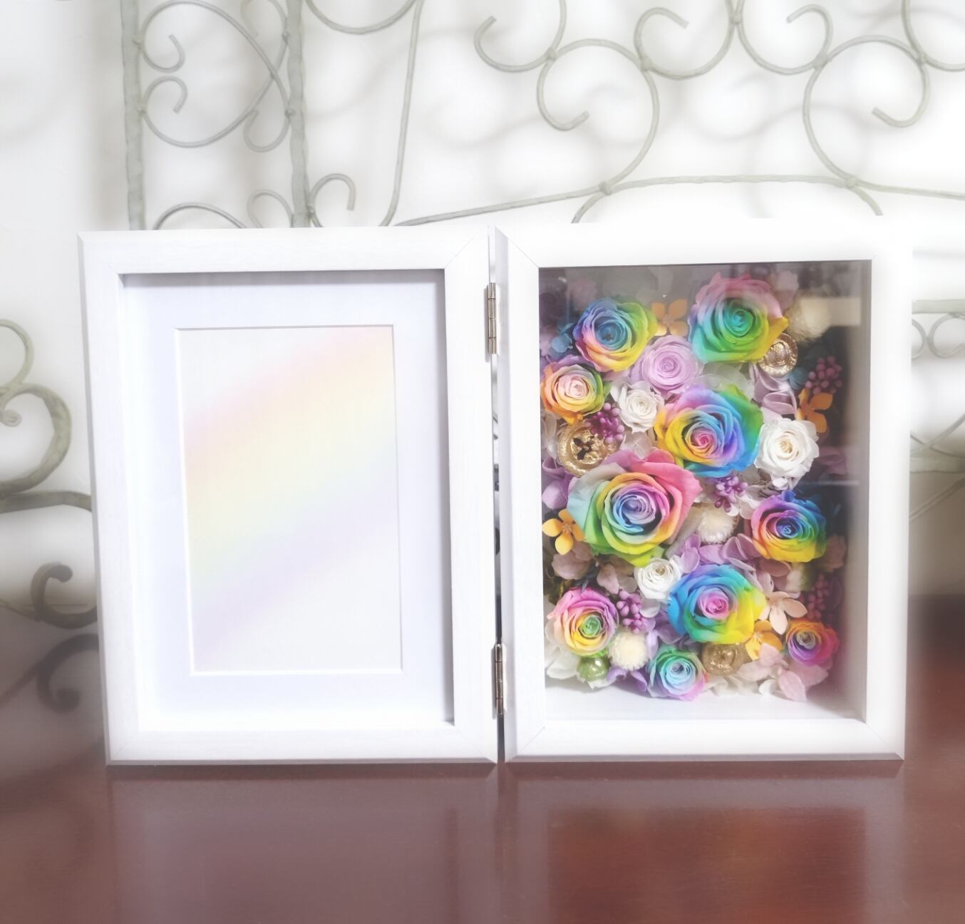 余白を活かして、より鮮明にレインボーローズが映えてきます。