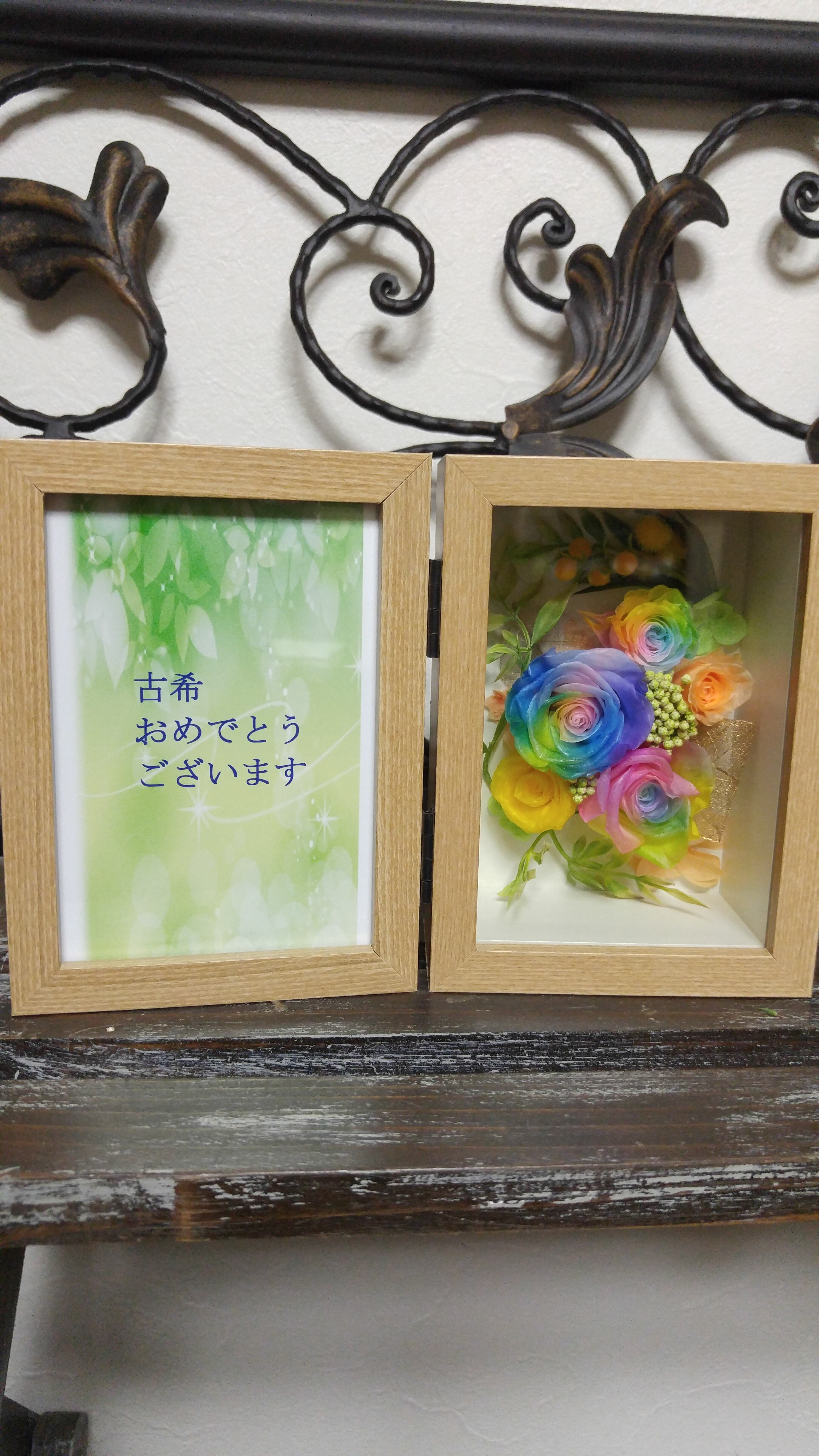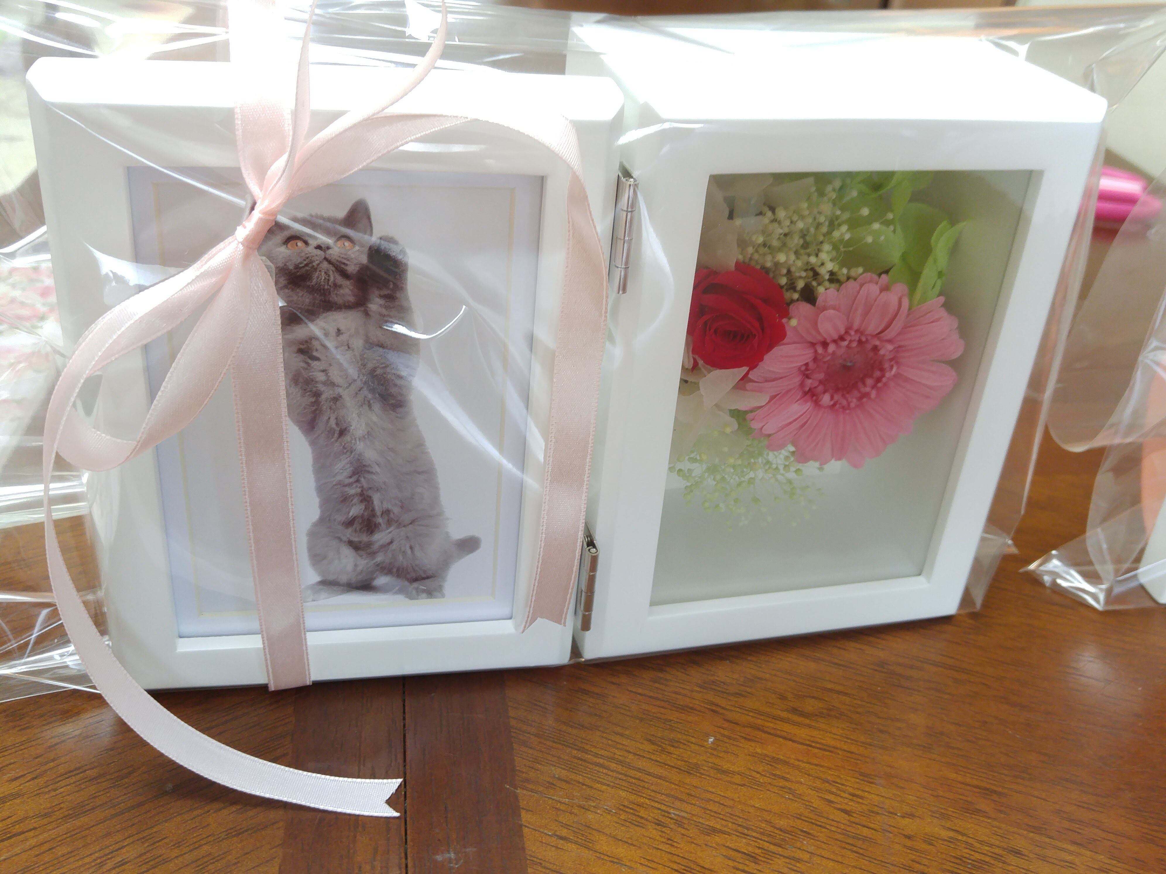 シックなフォトフレームと、ワンポイントのローズを使ったプリザーブドフラワー。
